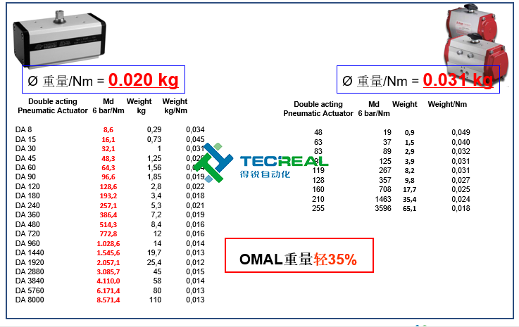 同樣我們先看雙動(dòng)型,OMAL的? 重量/Nm = 0.020 kg,而B(niǎo)ray? 重量/Nm = 0.031 kg,從上面的結(jié)果可以看出,OMAL撥叉式氣動(dòng)執(zhí)行器重量比對(duì)方輕35%。重量輕,則代表體積也小,那么在客戶安裝和維修的時(shí)候也會(huì)更加方便。