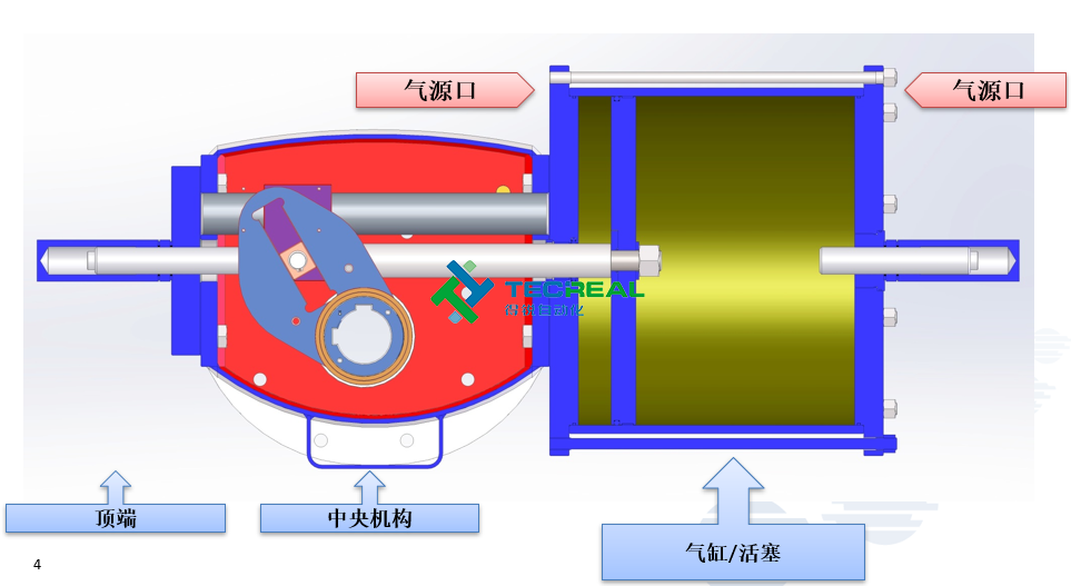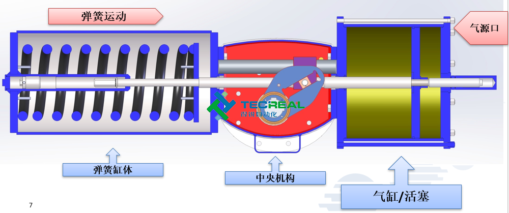這種執(zhí)行機構(gòu),撥叉是位于中央機構(gòu)控制活塞運動,但與氣缸活塞是分開的,這就解決了很多的密封問題,并且允許使用各種氣體或是液體控制,而不是只有空氣作為氣源.例如:水,氣體甲烷等。