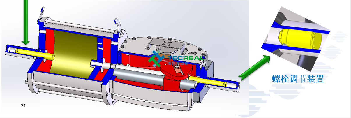 8.總的運行角度 100 ° (-5 ° +95 °),調(diào)節(jié)螺栓可在執(zhí)行器打開或關(guān)閉的位置上進行± 5 °的調(diào)節(jié),而且不管是雙作用還是單作用,調(diào)節(jié)螺栓都有保護帽,確保功能的完整性。
