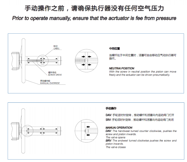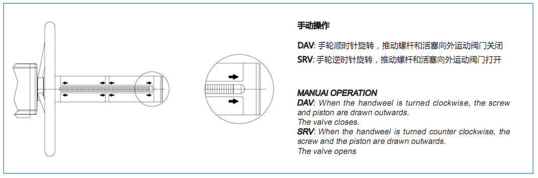 • 通過(guò)手輪旋轉(zhuǎn),推動(dòng)螺旋桿和執(zhí)行器活塞移動(dòng),手輪裝置由手輪、螺旋桿、保護(hù)管、軸承、特制壓蓋、特制活塞所組成